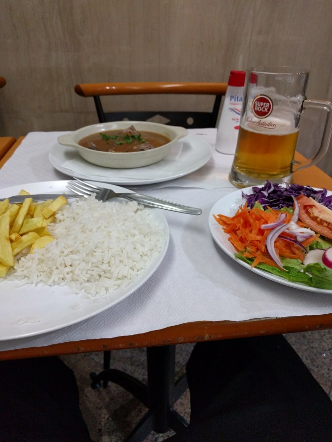 Zaraz obok hostelu było coś w rodzaju sportowego baru. Głownie męska klientela, proste wnętrze, na ścianie telewizor, a na nim oczywiście piłka nożna. Do jedzenia natomiast typowo portugalska porcja. Mięsna potrawka do tego frytki, warzywa i ryż. Starczyłoby dla sumoki.