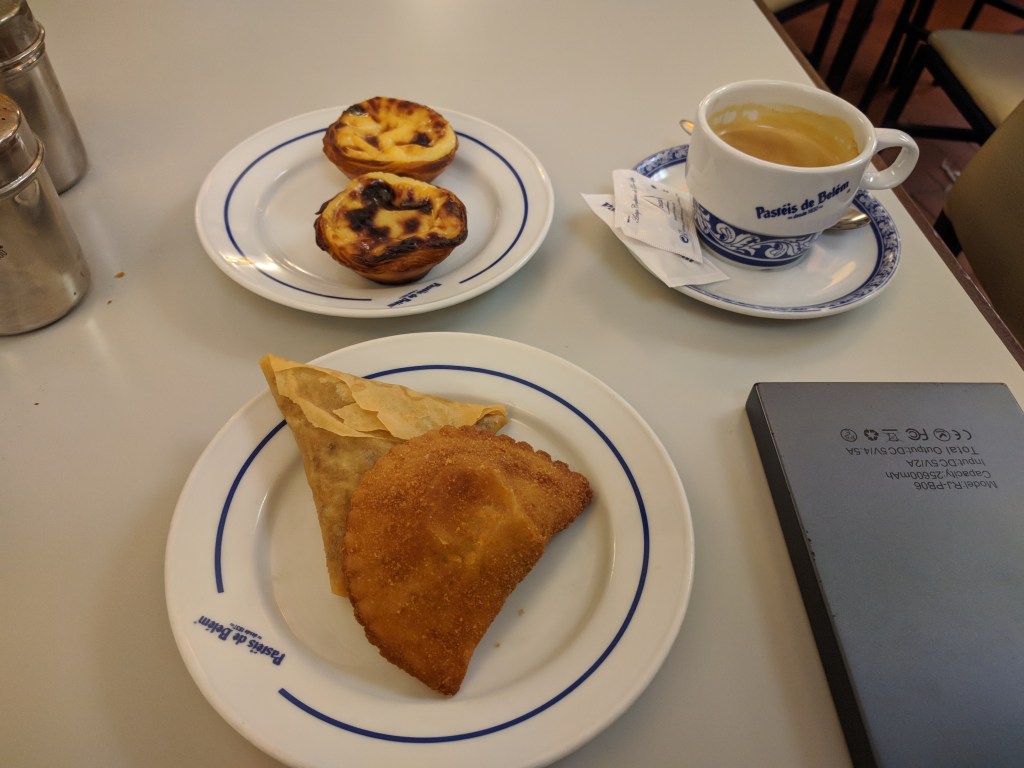 Portugalia znana jest z Pasteis de nata, rodzaju babeczek z budyniem. Belem ma swoją własną odmianę tego przysmaku, własnie Pasteis de Belem. Jako że nie jestem koneserem, nie poznałem się na różnicy, tym niemniej deser był smaczny. Sprobowałem też lokalnego pierożka.